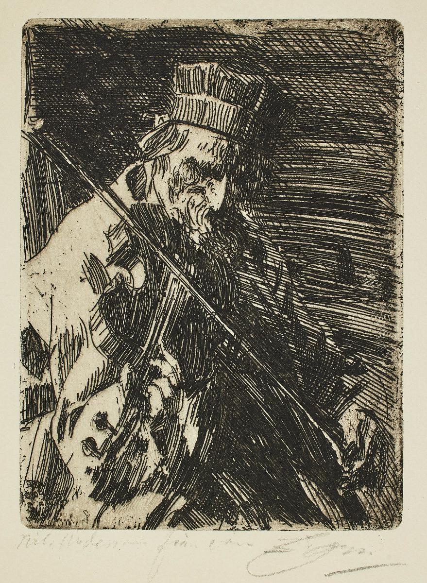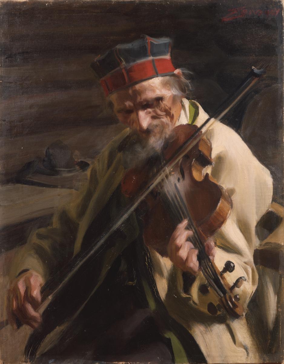 Anders Zorns målning föreställer Hins Anders, Dalarnas främste violinist. Iförd rund hatt och en lång kalvskinnströja spelar han koncentrerat på sin fiol. År 1885 bosatte sig Anders Zorn permanent i Mora tillsammans med hustrun Emma. Paret engagerade sig för att rädda den Svenska folkmusiken, där dragspelet vid denna tid höll på att tränga ut traditionella instrument som horn och fiol. Zorn var en av Sveriges mest betydelsefulla konstnärer kring föra sekelskiftet och gjorde även stora framgångar som porträttmålare internationellt, framförallt i USA där han anlitades av presidenter, företagsledare och societeten.